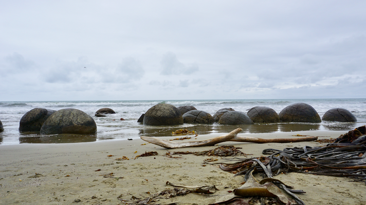 Um diese nahezu perfekt runden Steinkugeln ranken sich unter den Maori Mythen und Sagen, welche diesen Ort mystisch machen. Vor allem bei Sonnenaufgang, schönem Wetter und Ebbe. Wie ihr wisst, wir hatten Regen, Nachmittag und Flut :)
